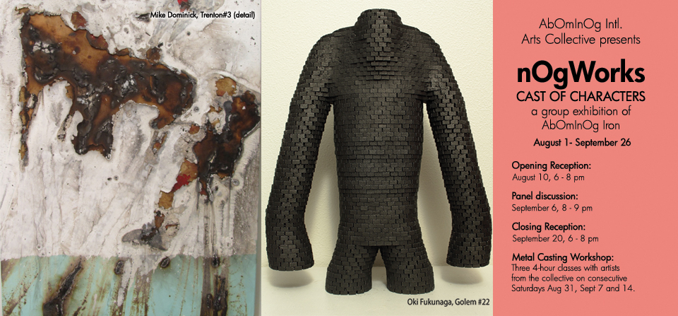 From August 6 – September 21, 2013 the Main Gallery at Artworks Trenton was filled with the cast-iron sculptures of the artists who make up AbOmInOg Intl. Arts Collective. nOgWorks: CAST OF CHARACTERS represents the first time the Collective shows sculpture created together over the course of our 14 year history using our incomparable furnace– the AbOminOg.